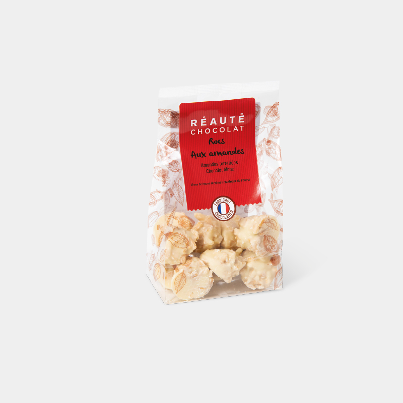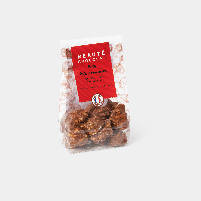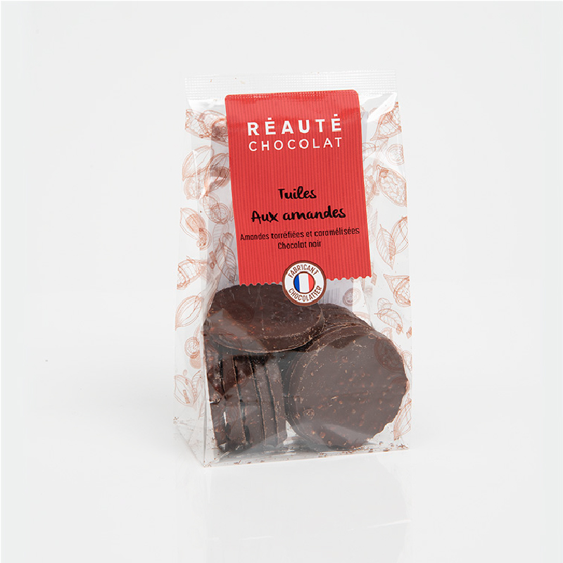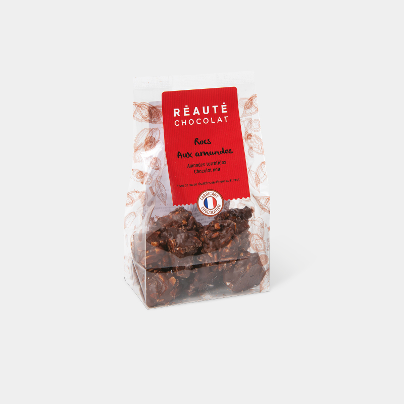 Eclats d’amandes torréfiées mêlées au chocolat noir.