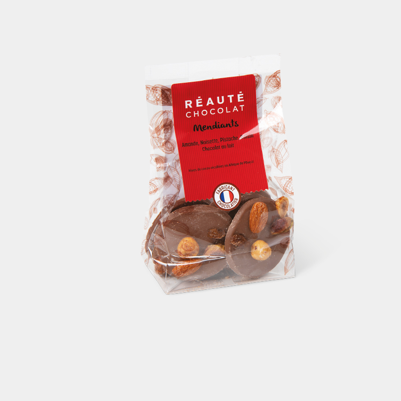 Palet au chocolat au lait, amande, noisette, pistache et raisin.