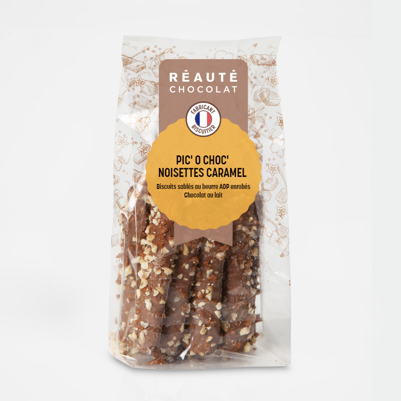Bâtonnet sablé enrobé de chocolat au lait et parsemé d’éclats de caramel au beurre salé AOP d’Isigny et d’éclats de noisettes torréfiées.