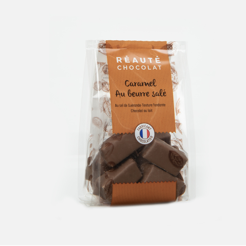 Chocolat mêlé au caramel fondant au beurre salé de Guérande. Enrobage chocolat au lait