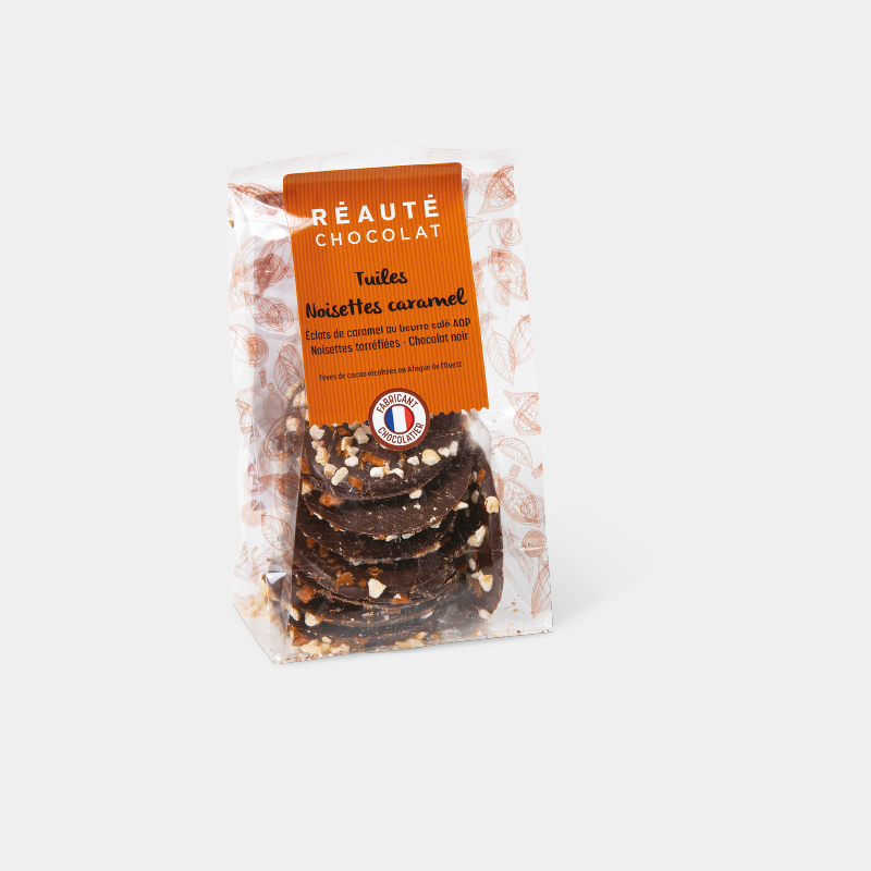 Noisettes torréfiées et éclats de caramel au beurre salé d’Isigny AOP. Palet au chocolat noir.