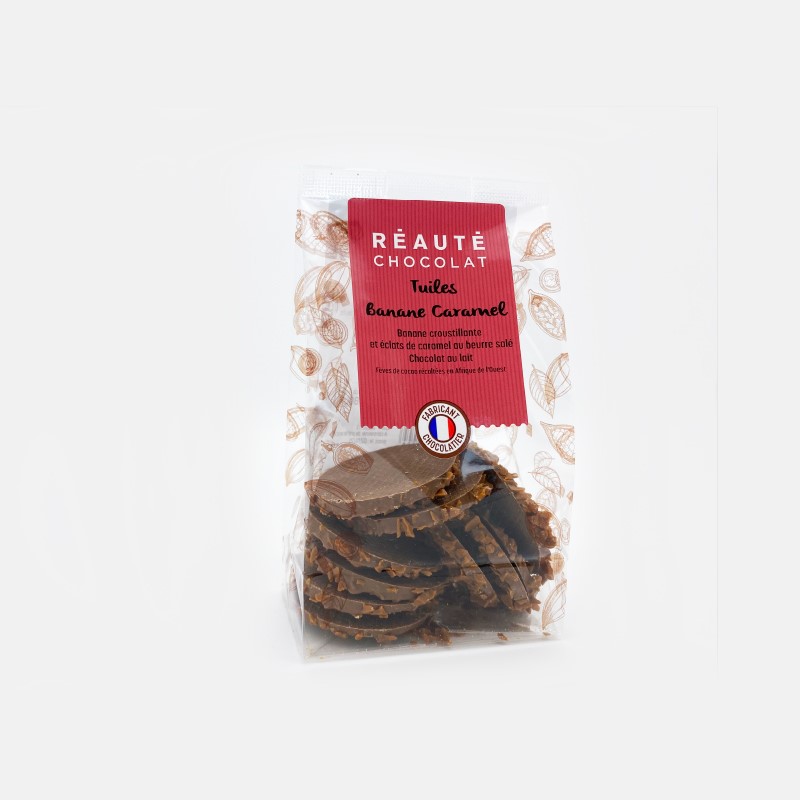 Bananes croustillantes, éclats de caramel au beurre salé d’Isigny AOP et chocolat au lait.