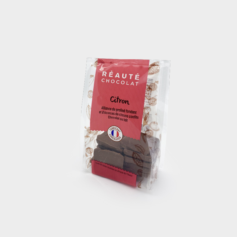 Praliné fondant amandes et noisettes et cubes d’écorces de citron confits. Enrobage chocolat au lait.