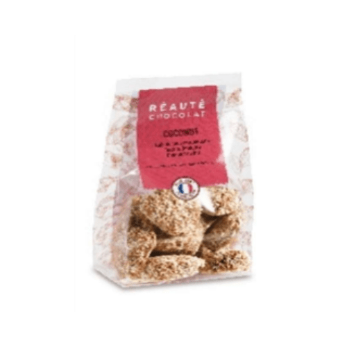 Fourrage fondant à la noix de coco caramélisée et au chocolat blanc. Enrobage chocolat au lait parsemé de noix de coco râpée.