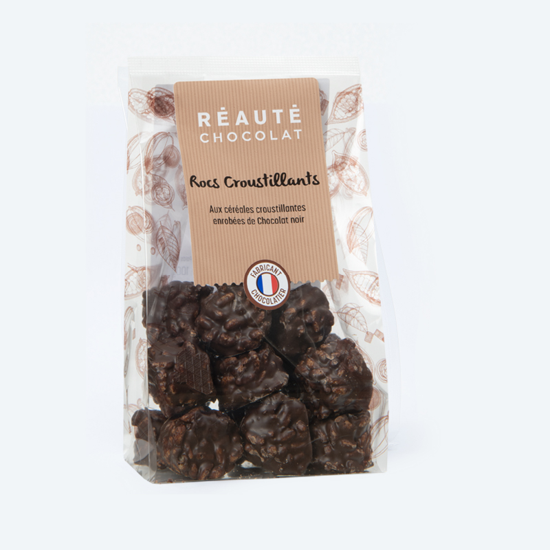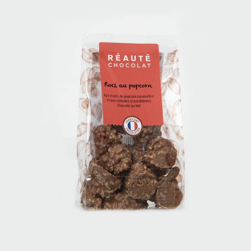 Chocolat au lait, céréales croustillantes, maïs grillé et popcorn caramélisé. Effet crunchy.