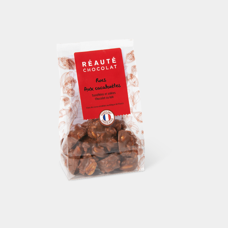 Chocolat au lait, cacahuètes torréfiées et salées, céréales croustillantes.