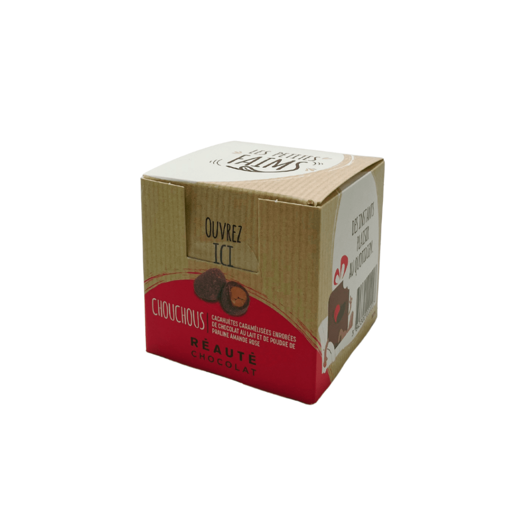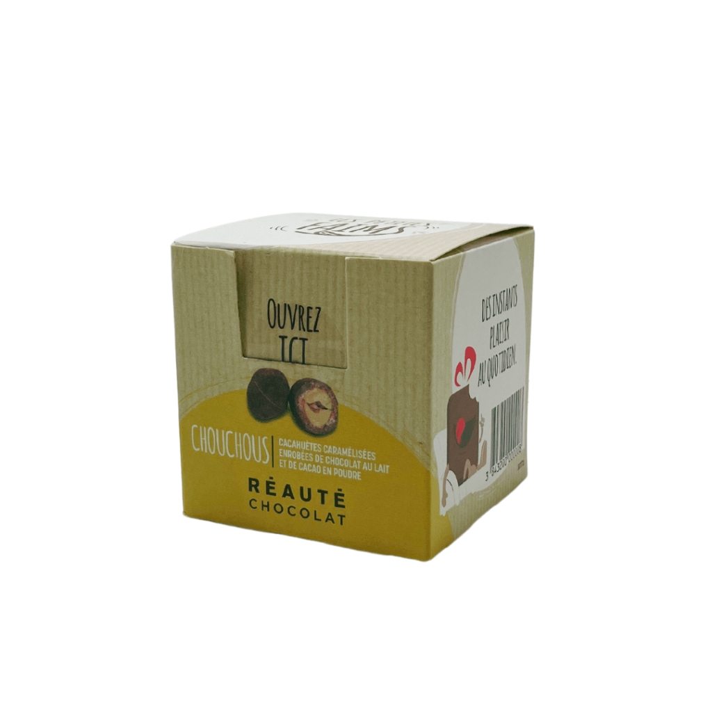 Cacahuètes caramélisées enrobées de chocolat au lait et de cacao en poudre.